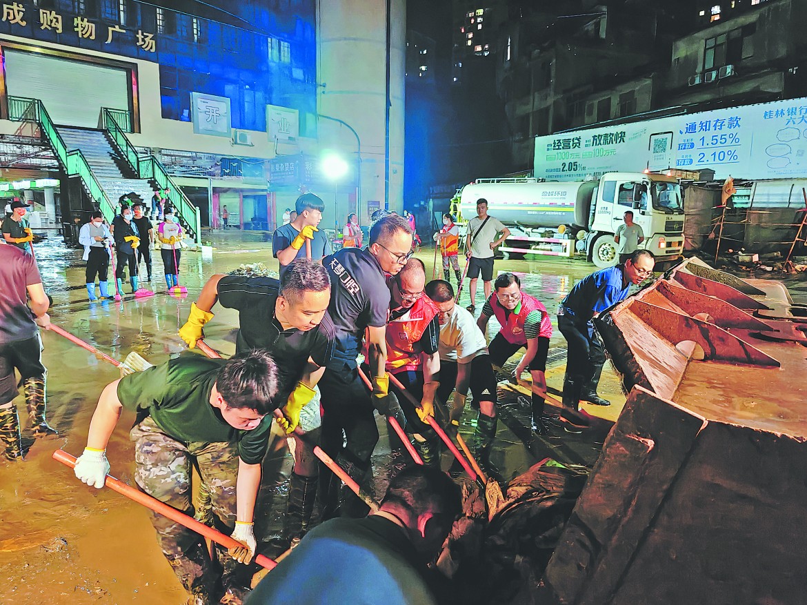 10月2日晚,龙州海成农贸市场内洪水退去,淤泥深积,近550户商户经营中断。龙州县政协闻“讯”而动,迅速组织委员、干部组成“复市攻坚队”。经过数小时连续奋战,市场逐渐恢复原貌,有力守护了群众的“菜篮子”。(卢荣涛 姚忠诚)