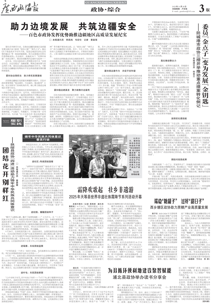 近年来,百色市政协深入贯彻落实党中央“治国必治边、治边先稳边”战略部署,聚焦边境发展与安全两件大事,紧扣治边稳边强边积极担当作为,不断书写助力边疆地区统筹高水平安全和高质量发展的履职新篇章。