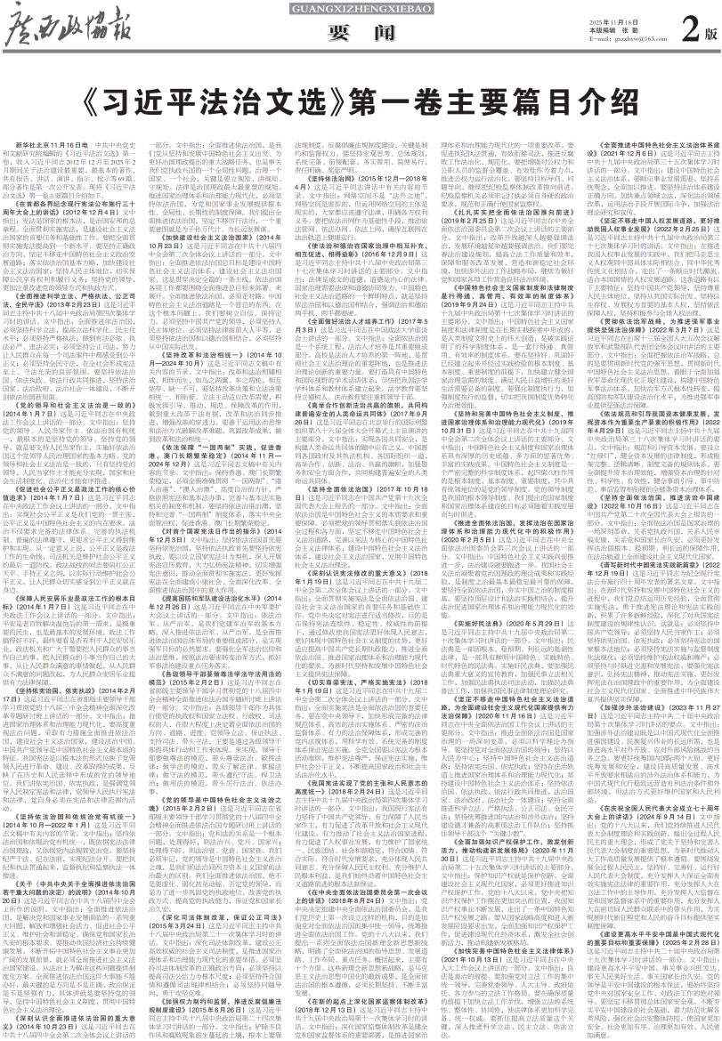 新华社北京11月16日电 中共中央党史和文献研究院编辑的《习近平法治文选》第一卷,收入习近平同志2012年12月至2025年2月期间关于法治建设最重要、最基本的著作,共有报告、讲话、演讲、指示、批示等69篇。部分著作是第一次公开发表。现将《习近平法治文选》第一卷主要篇目介绍如下。