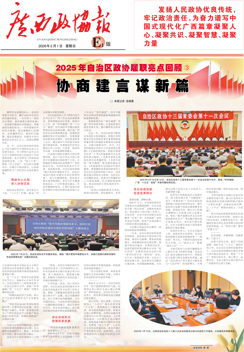 征程万里风正劲,重任千钧再奋蹄。2026年是“十五五”规划开局之年,在自治区党委的坚强领导下,自治区政协将继续在服务发展大局中强化使命担当,聚焦“十五五”规划目标任务,凝心聚力、奋楫争先,为奋力谱写中国式现代化广西篇章作出更大贡献。