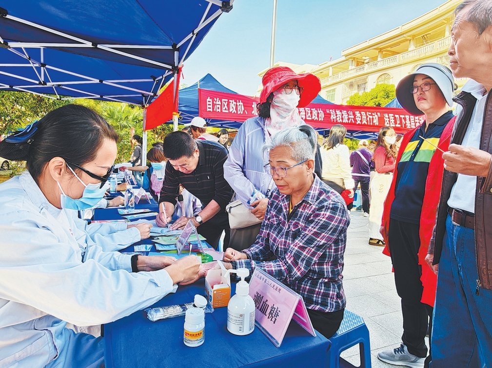 2025年11月26日,自治区政协教科卫体委员会联合北海市政协、银海区政协,在北海市疍家小镇开展“科教振兴 委员行动”送医卫下基层活动。活动现场,来自医疗机构的政协委员及专家团队为居民提供血压血糖检测、心肺听诊、健康咨询等医疗服务,通过“零距离”健康服务将优质医疗资源送到群众家门口。