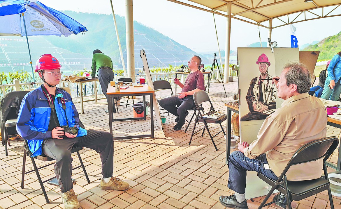 2025年,自治区政协主办“中国书画名家壮美广西采风行”活动,邀请43位全国书画名家深入广西,创作关于平陆运河等重大工程、民族团结的壮丽画卷。图为书画家为平陆运河建设者作画。