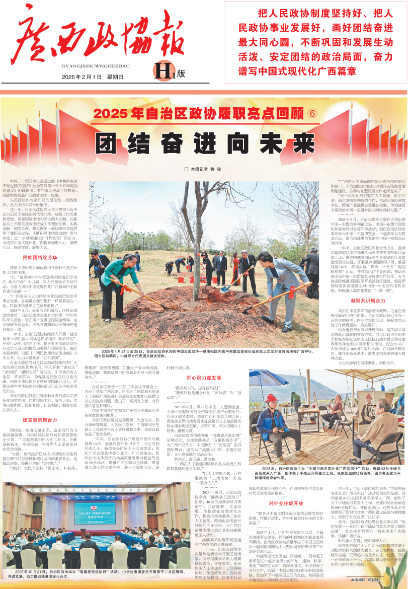 一年来,自治区政协深化对外交往,邀请东盟国家驻南宁领事机构外交使节旁听政协全体会议;围绕防城港国际医学开放试验区高质量发展等议题,开展重点课题调研7项、重要视察10次,策划实施“我为‘十五五’规划献良策”活动,并成功出访中亚两国,推动两国出任中国—东盟博览会特邀合作伙伴,有力推进防城港国际医学开放试验区建设,促进西部陆海新通道建设同中国—中亚合作有机衔接,积极融入高质量共建“一带一路”。