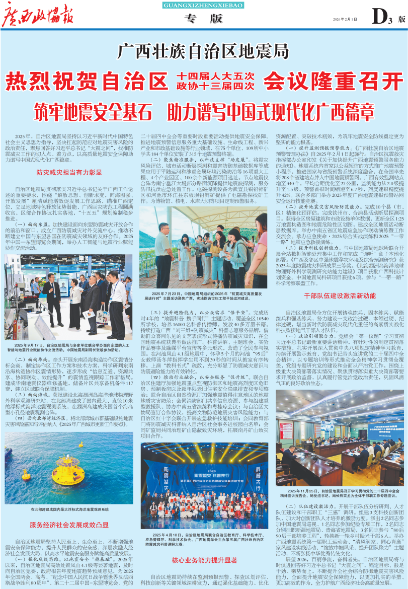 2025年,自治区地震局坚持以习近平新时代中国特色社会主义思想为指导,坚决扛起防范应对地震灾害风险的政治责任,聚焦回答好习近平总书记“大震之问”,找准防震减灾工作的切入点、着力点,以高质量地震安全保障助力谱写中国式现代化广西篇章。