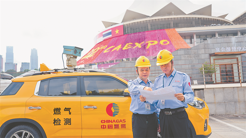 中国燃气工作人员在第22届东博会前进行燃气监测。刘俊杰/摄