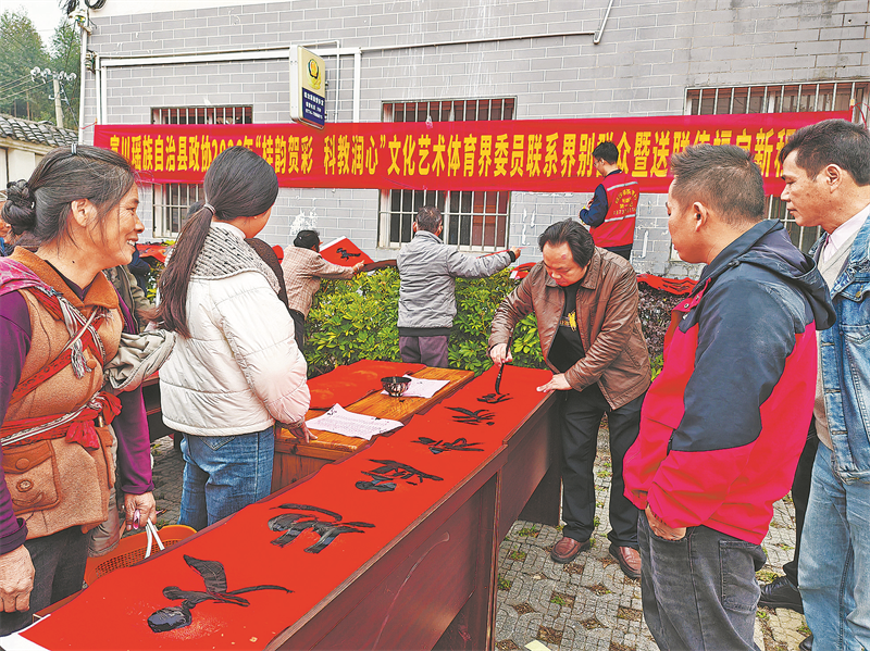 2月4日至6日,富川瑶族自治县政协文化艺术体育界委员分别到葛坡镇林桂村、白沙镇茶青村,开展“桂韵贺彩 科教润心”联系界别群众暨送联传福启新程活动,为村民书写春联和“福”字,送出新春祝福。 李春嫦/摄