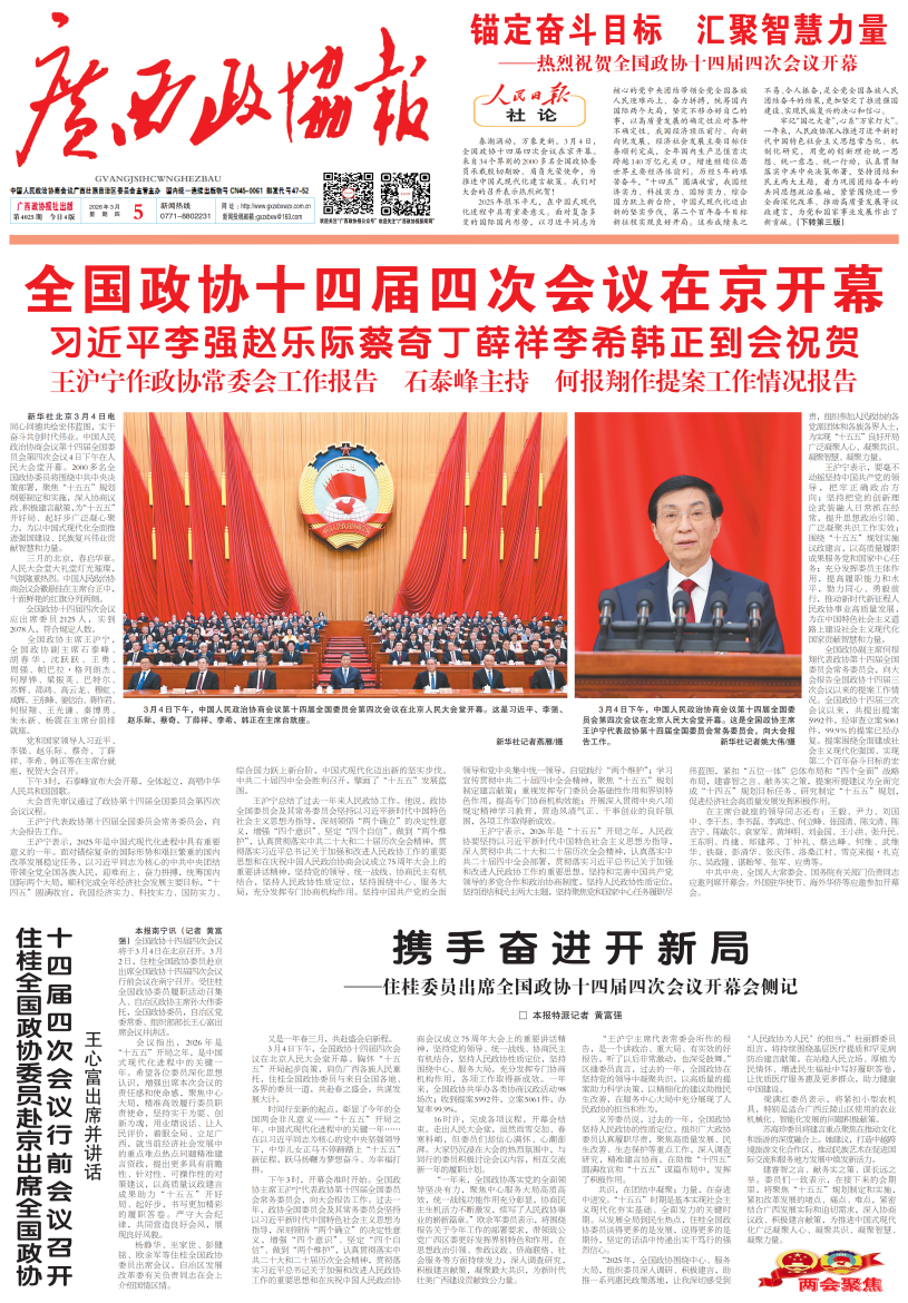 新华社北京3月4日电 同心同德共绘宏伟蓝图,实干奋斗共创时代伟业。中国人民政治协商会议第十四届全国委员会第四次会议4日下午在人民大会堂开幕。2000多名全国政协委员将围绕中共中央决策部署,聚焦“十五五”规划纲要制定和实施,深入协商议政、积极建言献策,为“十五五”开好局、起好步广泛凝心聚力,为以中国式现代化全面推进强国建设、民族复兴伟业贡献智慧和力量。