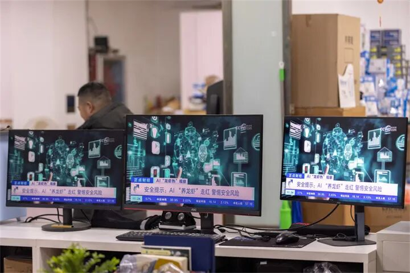 3月11日,在位于浙江省湖州市吴兴区飞英街道的颐高数码广场,电脑显示器在播放开源AI智能体“龙虾”的相关新闻。 新华社发 (伊凡/摄)
