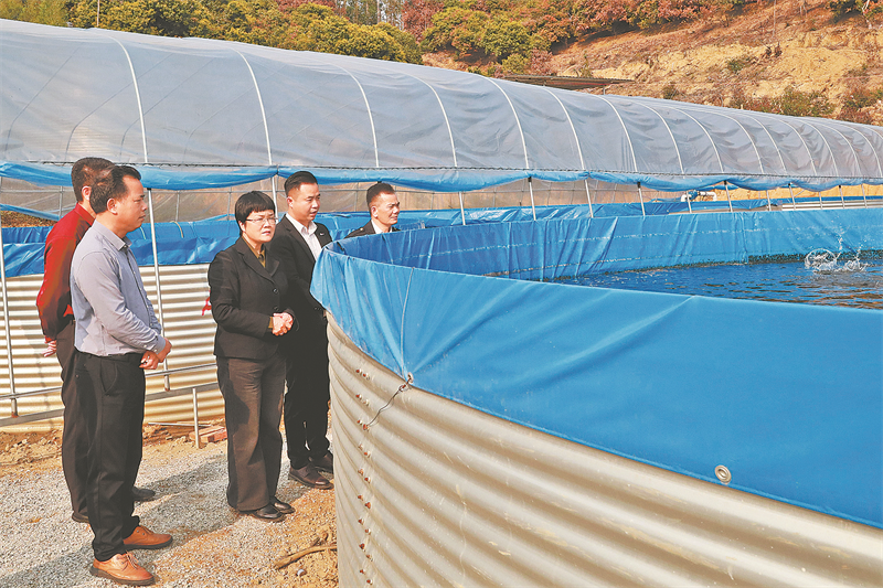 2025年4月2日,灵山县政协副主席叶缨(右三)带队到烟墩镇祥羽水产养殖场开展特色农业产业发展调研,了解淡水鲈鱼养殖助推乡村振兴、产业振兴相关情况。 黄荷 摄