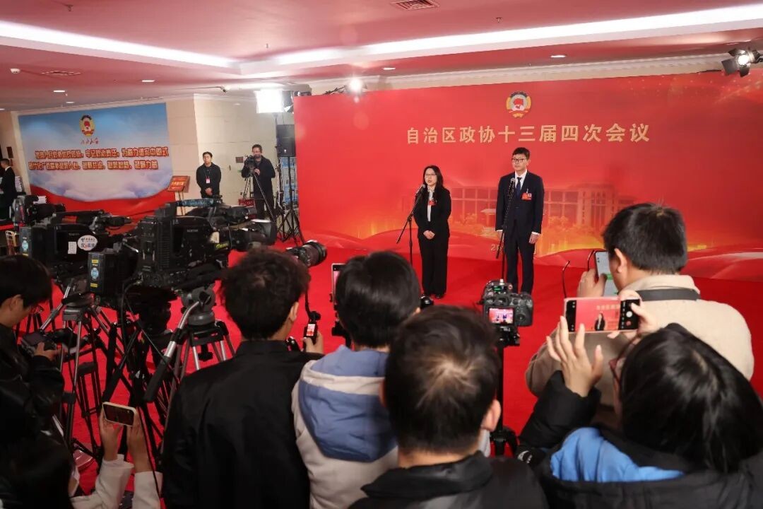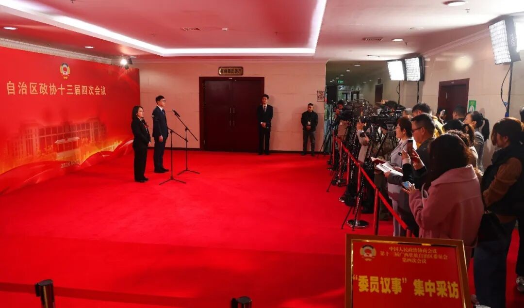 2月4日上午,自治区政协同心会堂礼堂大厅北侧,自治区政协十三届四次会议第二场“委员议事”集中采访现场气氛热烈。六位来自企业、科技、文化、统战、经济等领域的政协委员,结合一线履职实践,围绕跨境产业合作、绿色循环发展、桂港文化交融、侨力赋能家乡、服务消费提振、人工智能赋能等话题,畅谈心声,建言献策,展现了一幅幅凝心聚力、实干担当的生动履职画卷。