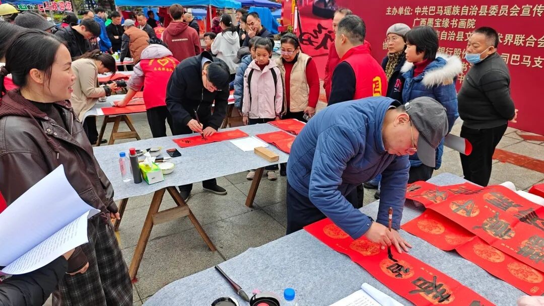 作为著名长寿之乡,巴马2009年被命名为“中国书法之乡”,书法文化深入人心。当日上午,名家们挥毫泼墨、倾情创作,前来求取春联的群众络绎不绝,一派热闹祥和的新春景象。