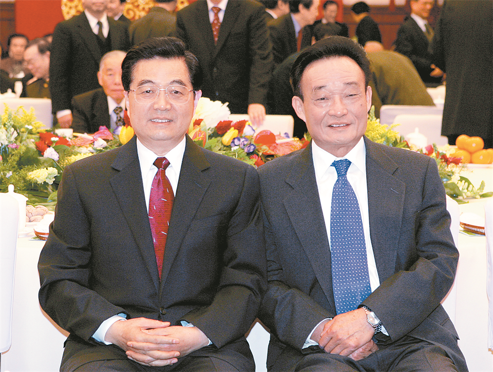 图④:二○○五年一月一日,全国政协在北京举行新年茶话会。这是胡锦涛同志与吴邦国同志在一起。 新华社记者樊如钧\摄