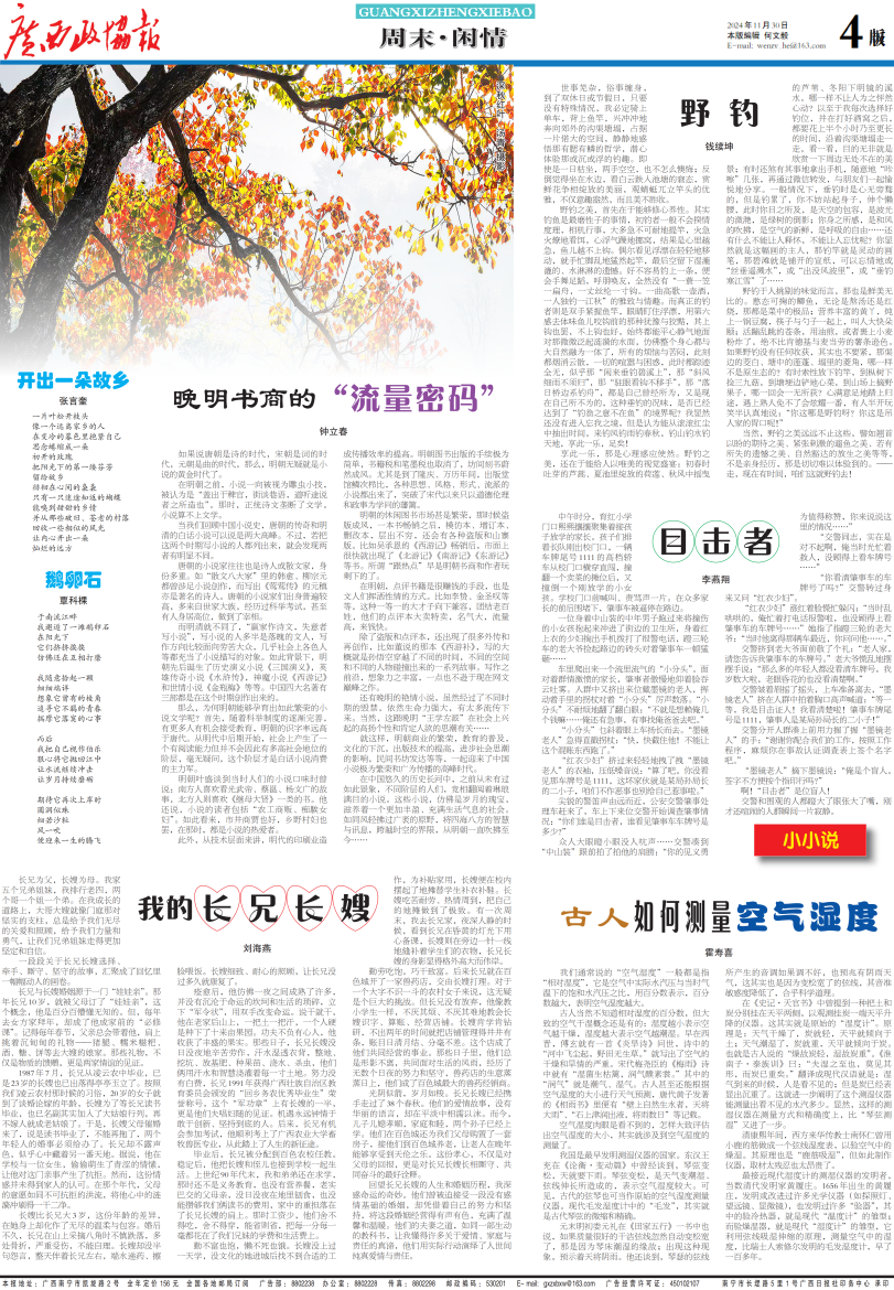 古人当然不知道相对湿度的百分数,但大致的空气干湿概念还是有的:湿度越小表示空气越干燥,湿度越大表示空气越潮湿。早在西晋,傅玄就有一首《炎旱诗》问世,诗中的“河中飞尘起,野田无生草。”就写出了空气的干燥和旱情的严重。宋代梅尧臣的《梅雨》诗中就有“湿菌生枯篱,润气醭素裳。”其中的“润气”就是潮气、湿气。古人甚至还能根据空气湿度的大小进行天气预测,唐代黄子发著的《相雨书》里便有“壁上自然生水者,天将大雨”、“石上津润出液,将雨数日”等记载。