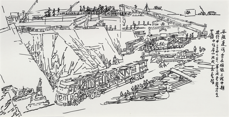 《平陆运河·企石枢纽工程中期写生》(国画)40×68cm