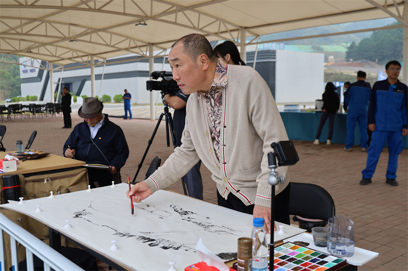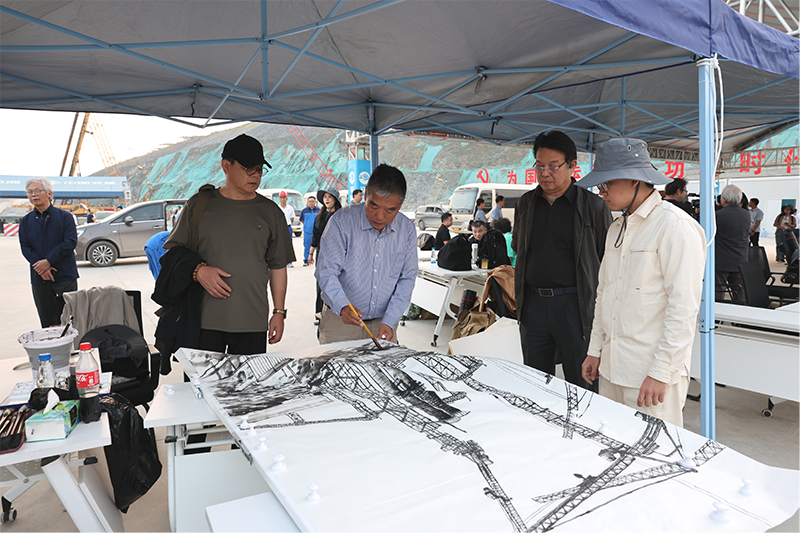 “每个人都是时代的见证者和参与者。作为美术工作者,把这些建设者描绘下来,是我的责任,也是很暖心的事情。”全国政协委员、全国政协书画室副主任牛克成把远处正在劳作的工人画进了他的画中,工人们看到画后满心欢喜。
