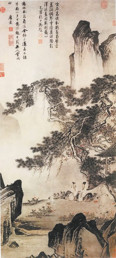 若说《东篱归影图》是独对秋光的孤吟,那么上海博物馆藏的《东篱赏菊图》便是群贤毕至的雅集。画面中央,青松翠柏环绕间,一座茅亭隐现,陶渊明与友人端坐于石上,身着宽袍大袖,神态悠然,正举盏品茗,似在谈论诗文。亭前有童子浇菊烹茶,远处是峰峦如黛,近处是满地金菊傲霜怒放。画面左上方,唐寅自题诗一首,内容为:“满地风霜菊绽金,醉来还弄不弦琴。南山多少悠然趣,千载无人会此心。”这首诗不仅为《东篱赏菊图》增添了浓厚的文人雅趣,更通过诗句与画面的结合,展现了唐寅作为画家、书法家、诗人的多重身份与才华。同时,诗中所表达的隐逸情怀与对自由、宁静的追求,也反映了唐寅在科举受挫后转向艺术创作时期的心境变化。