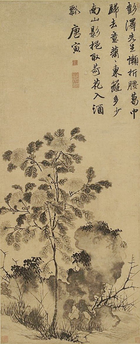 《东篱归影图》是唐寅晚年以没骨法绘就的墨色诗篇。画面中,秋菊傲立东篱之下,花瓣似蝶翼般轻盈颤动,墨色浓淡相宜,尽显菊之灵动与生机。菊花旁,嶙峋奇石兀然而立,石体仅用浓墨勾勒轮廓,线条简洁却力透纸背,与柔美的菊花形成刚柔相济之美。画面背景留白,给人以无限遐想空间,仿佛那片空灵之处便是远离尘世的净土。右上方,唐寅以行书题诗:“彭泽先生懒折腰,葛巾归去意萧萧。东篱多少南山影,挹取荷花入酒瓢。”其笔力遒劲洒脱,诗中借陶渊明之典,抒发自身历经沧桑后的淡泊心境。整幅画作,以简洁的构图、写意的笔法,营造出一种孤高绝俗、悠然自得的氛围,让观者仿若置身于秋日黄昏的东篱之下,与画家一同感受那份远离喧嚣、回归本真的宁静与超脱。