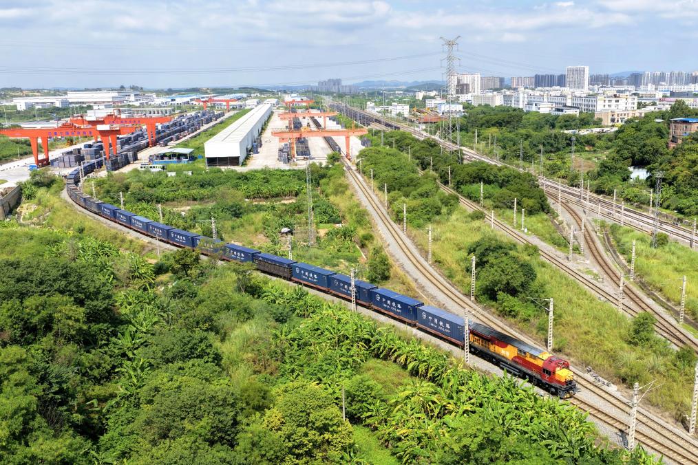 记者从中国铁路南宁局集团有限公司获悉,截至9月22日,2025年广西始发中越班列已累计发运出口货物2.6万标箱,同比增长173%,为区域产业链、供应链稳定和经贸往来注入强劲动能。图为一辆中越班列驶出南宁国际铁路港。邢广利/摄
