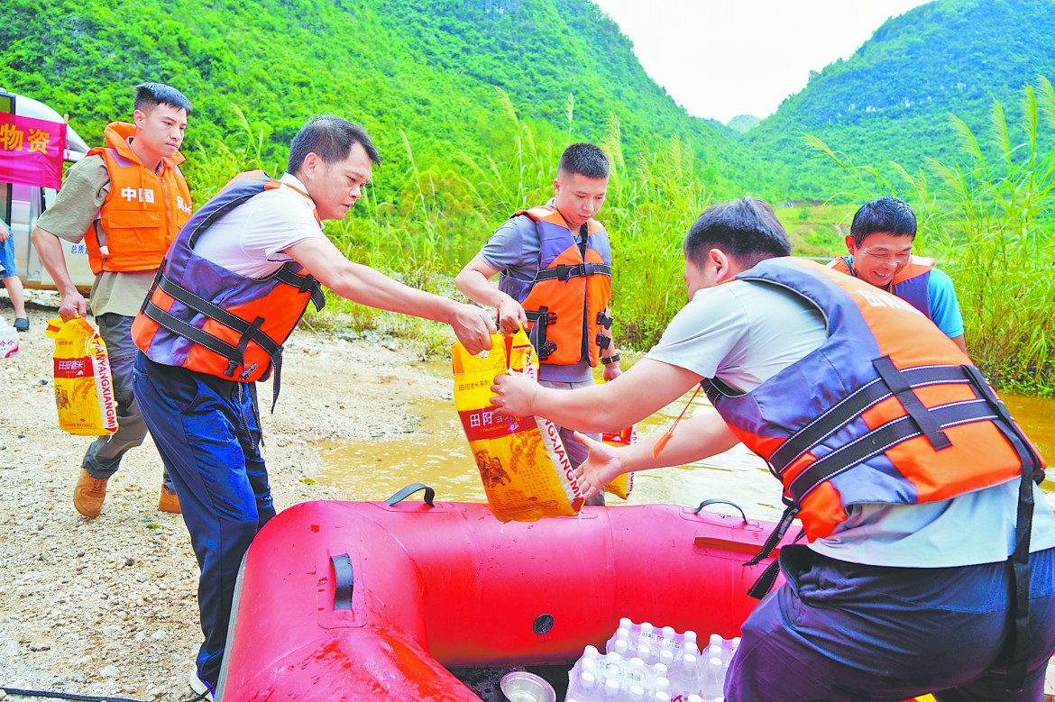 日前,百色市田阳区政协将获捐赠物资精准送达那坡镇、巴别乡受困群众手中,展现了政协系统上下联动、共克时艰的协作力量。图为田阳区政协服务队与巴别乡干部、驻村工作队搬运物资上橡皮艇,清点所需物品,保障受困群众基本生活需求。 (韦丽莎)