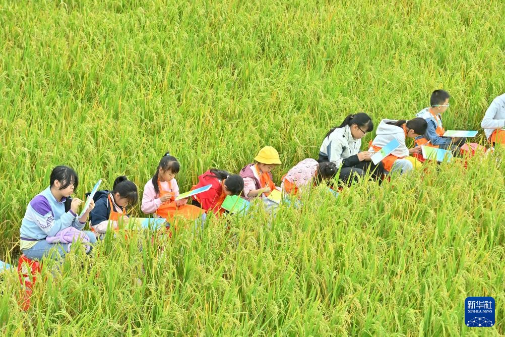 11月1日,柳州市柳江区举办“沃野柳江,丰景共享”庆丰收活动,人们通过民族歌舞表演、农特产品推介展销、农耕文化体验、农家美食品尝、农趣比赛等形式,共享秋收喜悦。图为11月1日,小朋友在柳州市柳江区泗浪村的田间写生。新华社记者 黄孝邦 摄