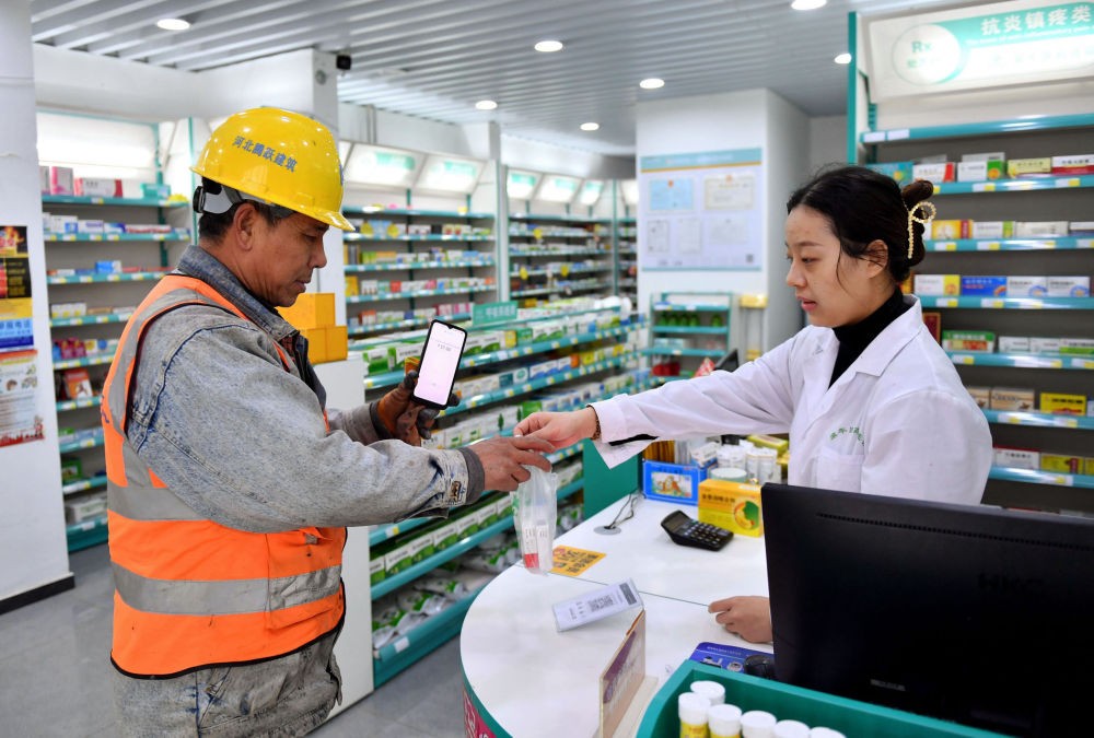 在雄安新区一家药店内,顾客在购买药品。秦婧 摄