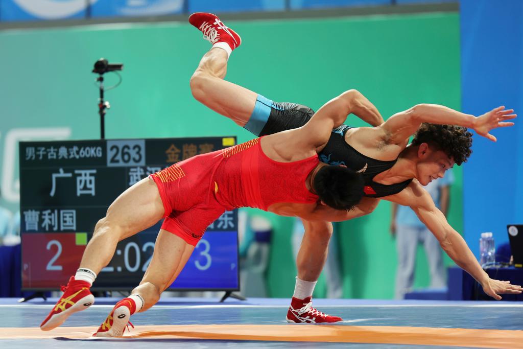 11月12日,广西队选手曹利国(下)与武汉体育学院队选手谭浩东在金牌赛中。最终,曹利国获得冠军。 新华社记者 李然 摄