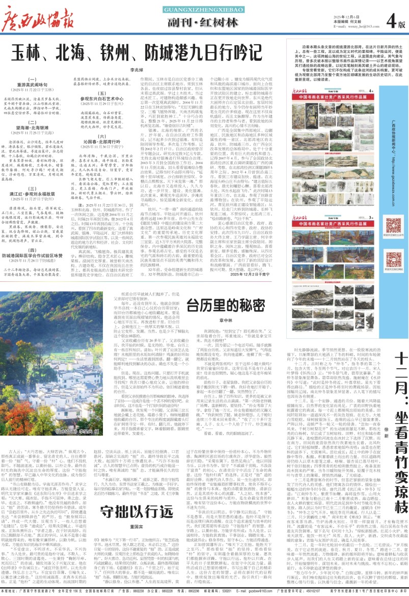 注:2025年11月22日至30日,到玉林和北海、钦州、防城港四市,作了一次休闲之旅。这是继2004年11月之后,时隔21年再到玉林;继2012年4月之后,时隔13年再到沿海三市。十分高兴,看到了四市的最新变化。还看了真武阁、银滩、平陆运河、龙门大桥和防城港国际医学试验区等,以及一些闻名遐迩的地方名片和经济、社会、文化时代发展的新地标。