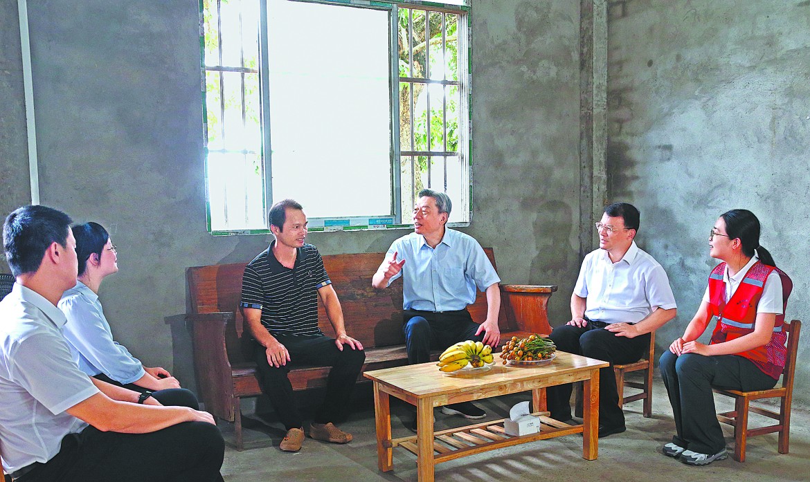 2025年7月9日,自治区政协主席孙大伟在龙州县下冻镇扶伦村布吕屯与脱贫户拉家常,了解生产生活和家庭收入情况。