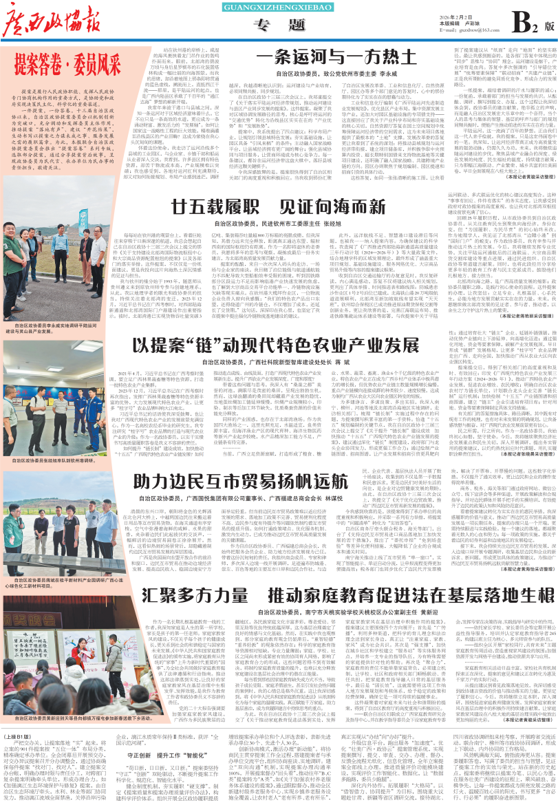 从提出建议到看见政策落地见效,我深切感受到政协建言资政的价值与推动落实的力量,更坚定了履职信心。今后,我将继续立足本职,深入调研,围绕促进家庭教育健康发展,发挥家庭家教家风在基层治理中的积极作用持续建言献策,让家庭家教家风建设在八桂大地的基层治理实践中绽放出更加绚丽的光彩。 (本报记者黄骏采访整理)