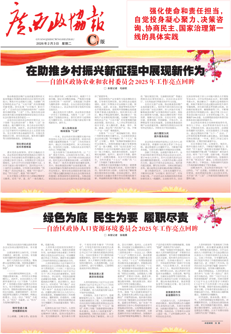 回顾2025年,农业和农村委坚持“专”出特色、“专”出质量,在助推农业更强、农村更美、农民更富的征程上迈出坚实步伐,为开创广西“三农”工作新局面贡献政协智慧和力量。