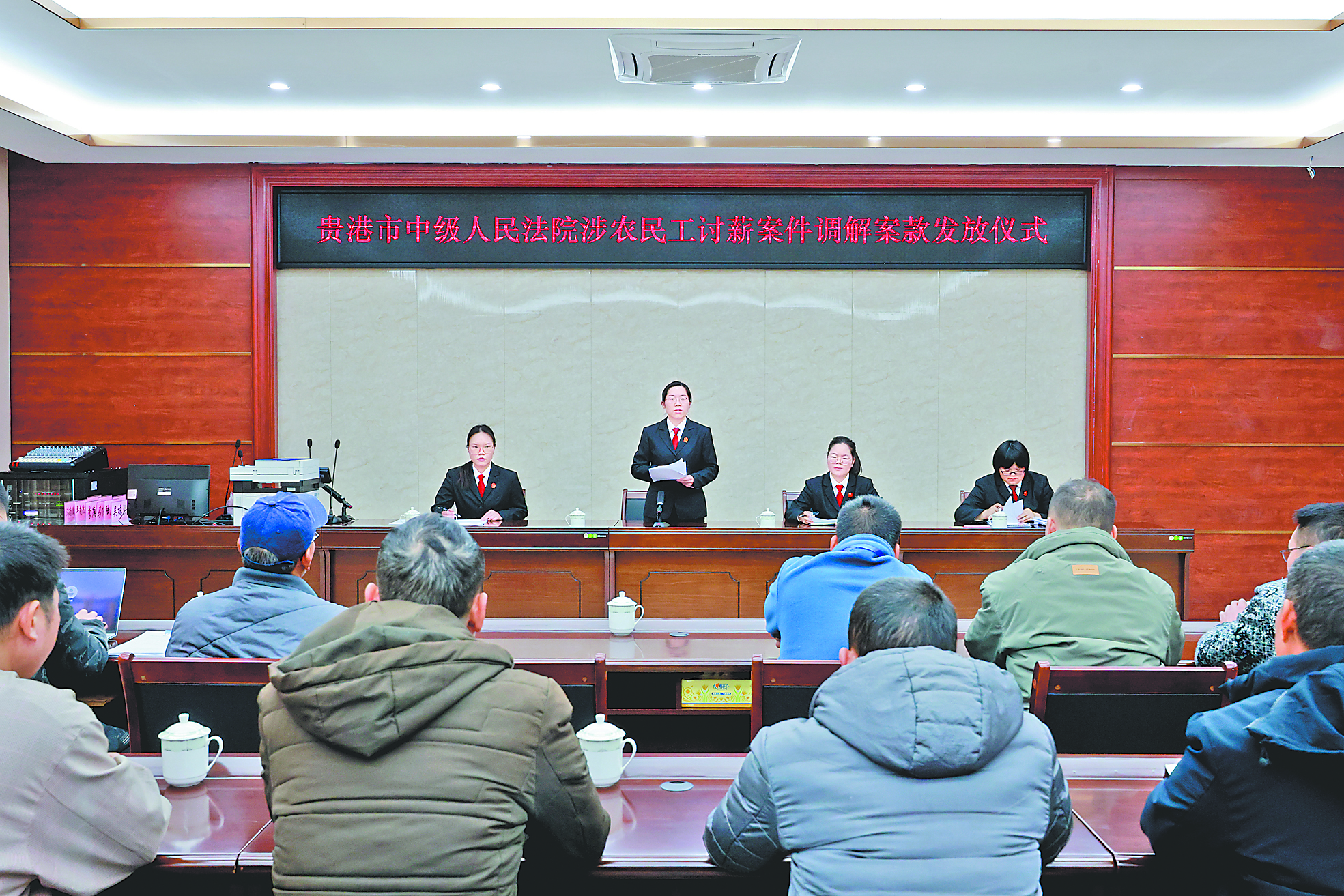 2025年3月6日,贵港市中级人民法院涉农民工讨薪案件调解案款发放仪式,26名农民工与案涉公司签署调解协议。