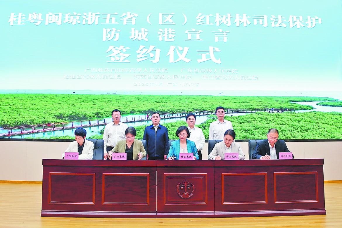 2025年4月17日,广西、广东、福建、海南、浙江五省(区)高级人民法院共同签署《桂粤闽琼浙五省(区)红树林司法保护防城港宣言》。