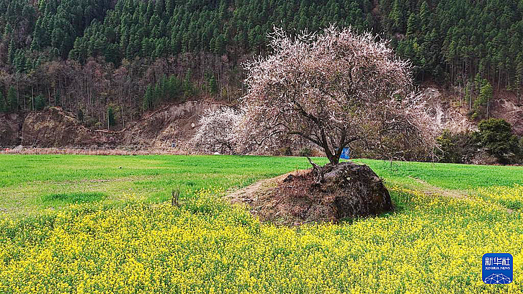 易贡油菜花田位于西藏林芝市波密县易贡乡。近期,连片油菜花竞相开放,桃花也缀满枝头,与远山相互映衬,构成一幅高原田园画卷。 新华社记者 普布次仁 摄