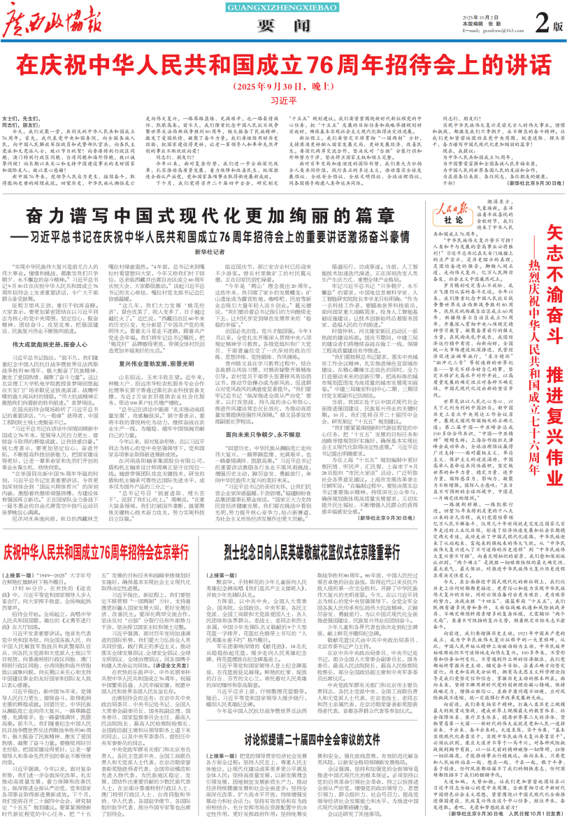 - 第 1 版: 要闻 庆祝中华人民共和国成立76周年招待会在京举行 习近平发表重要讲话