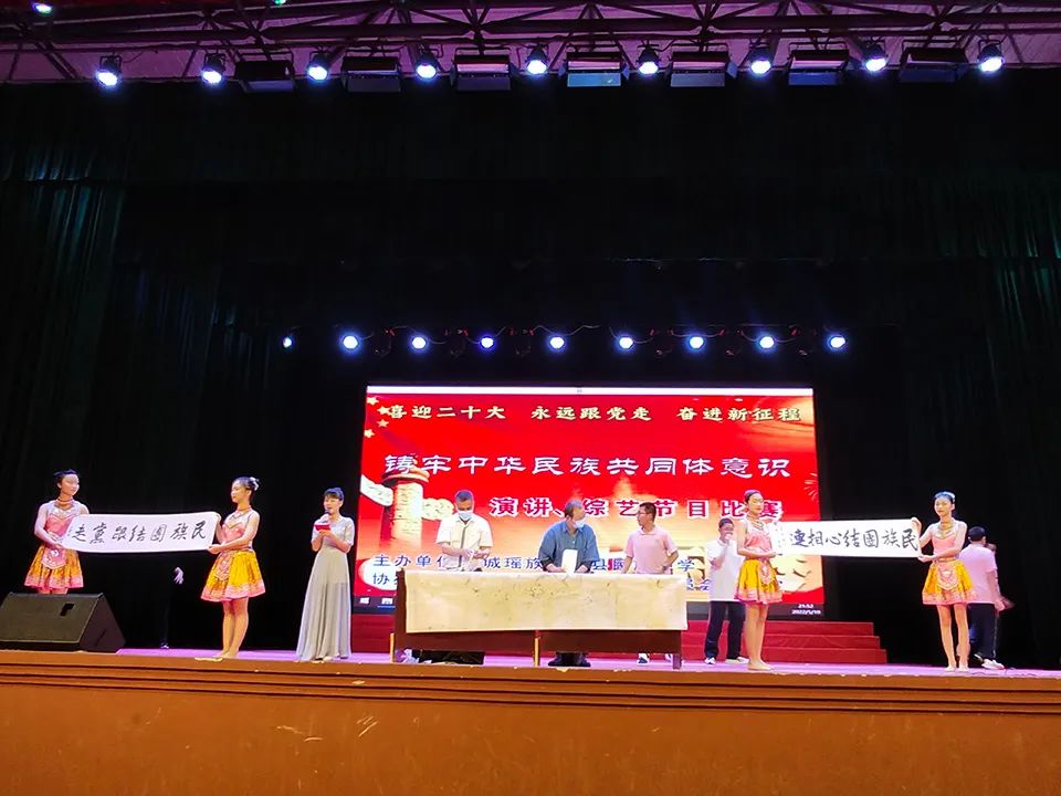 5月10日,恭城瑶族自治县政协办公室、恭城县民族中学联合举办了“喜迎二十大、永远跟党走、奋进新征程”暨铸牢中华民族共同体意识演讲、综合文艺比赛。丰富多彩的活动给学校师生带来了浓浓的瑶乡情,为该县政协开展铸牢中华民族共同体意识示范单位创建添上了精彩的一笔。