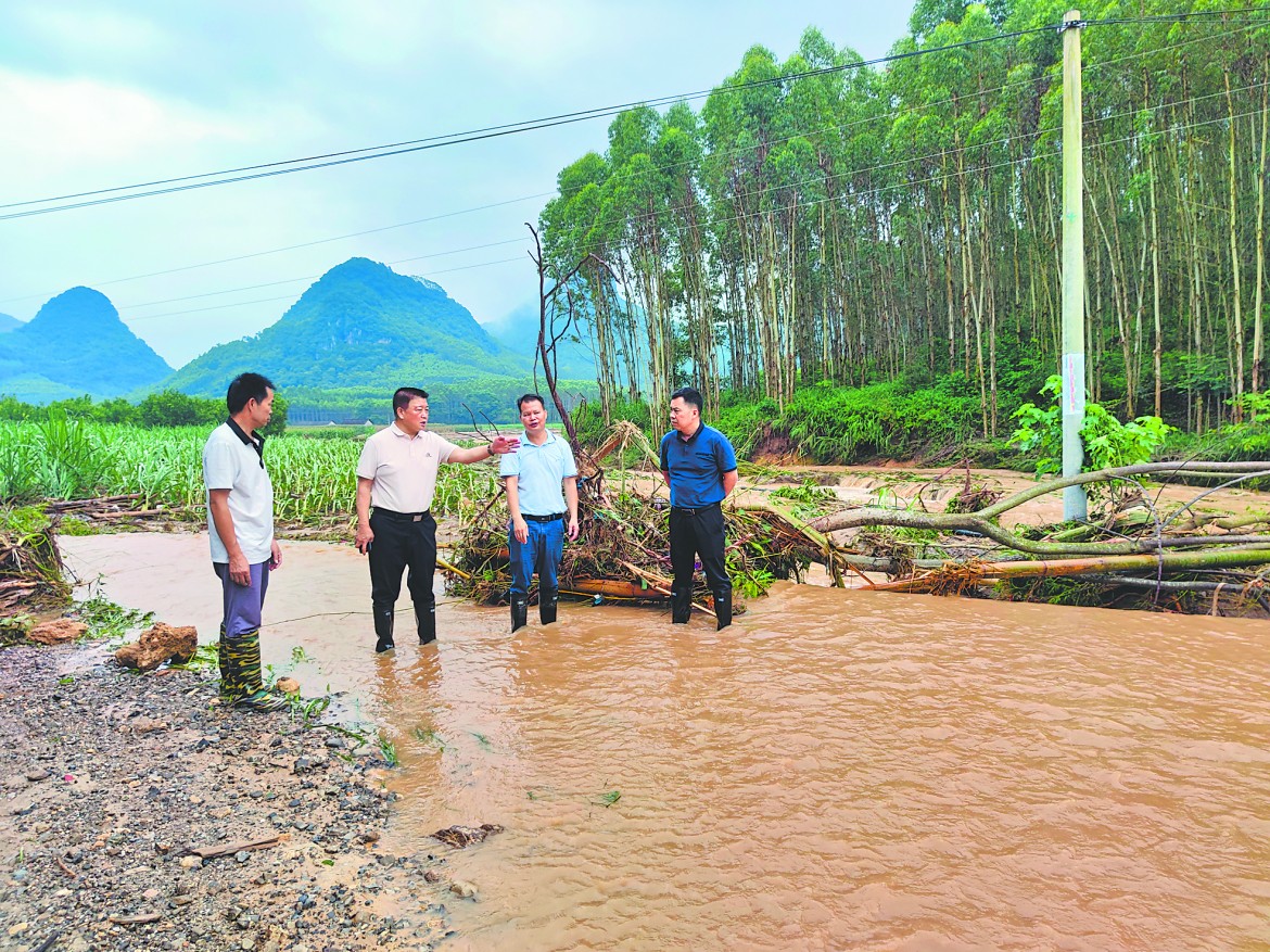 兴宾区政协主席、党组书记冉纪贵(左二)深入乡镇一线了解灾情,指导灾后重建工作。