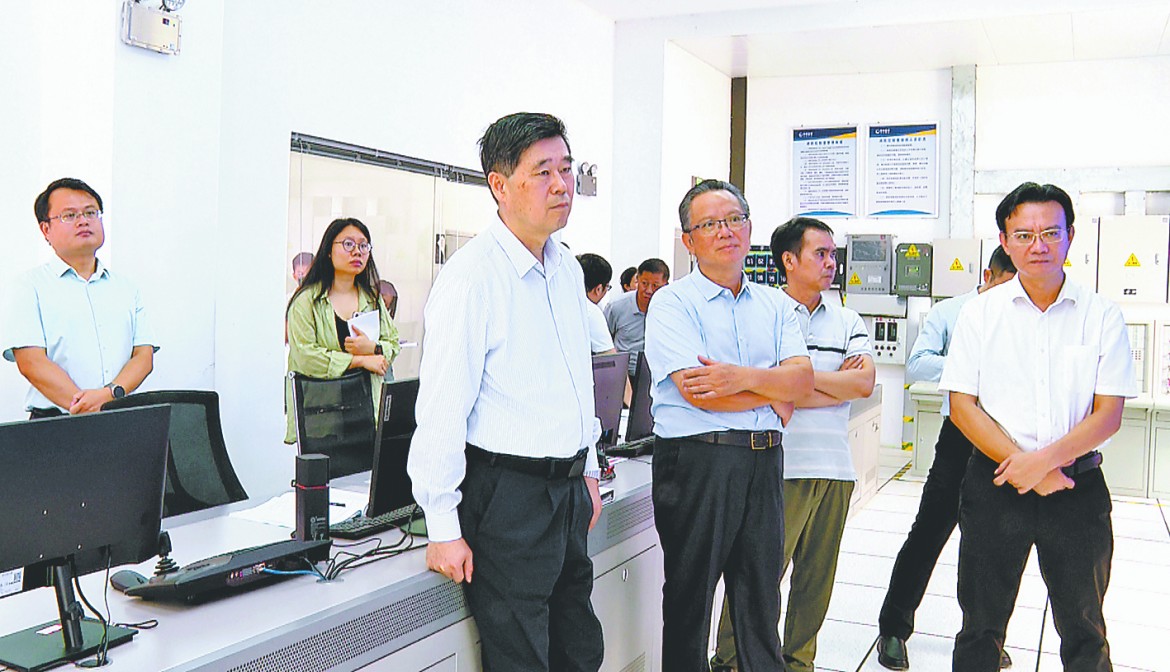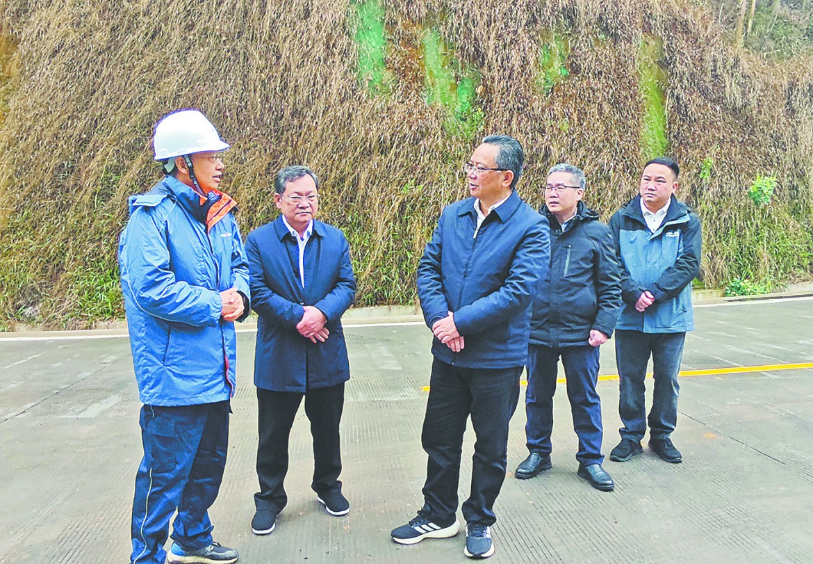 百色市政协主席石国怀 (中) 率队深入田东县抽水蓄能发电项目工地实地察看施工进度。