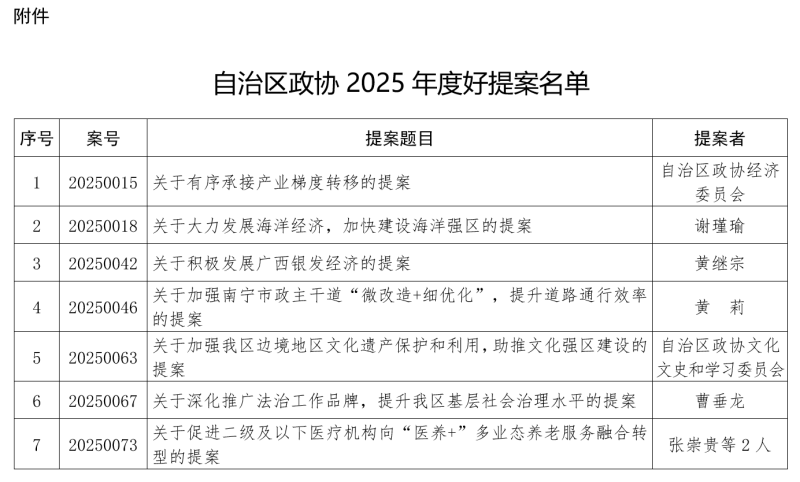 为表彰先进、树立榜样,激励引导广大政协委员、政协各参加单位、各专门委员会更好运用提案履职建言。根据《中国人民政治协商会议广西壮族自治区委员会提案工作条例》《政协广西壮族自治区委员会年度好提案评选办法(试行)》,经十三届自治区政协第四十四次主席会议研究,决定对《关于有序承接产业梯度转移的提案》等58件自治区政协2025年度好提案予以表扬。