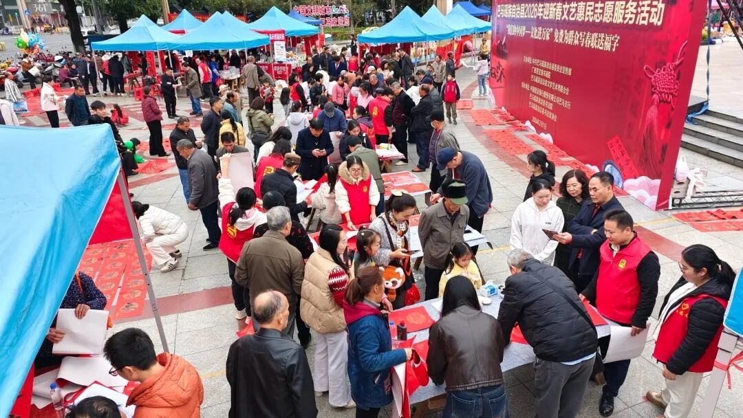 红笺铺展,墨香氤氲,书法家们挥毫不停,群众有序排队、满心期盼。